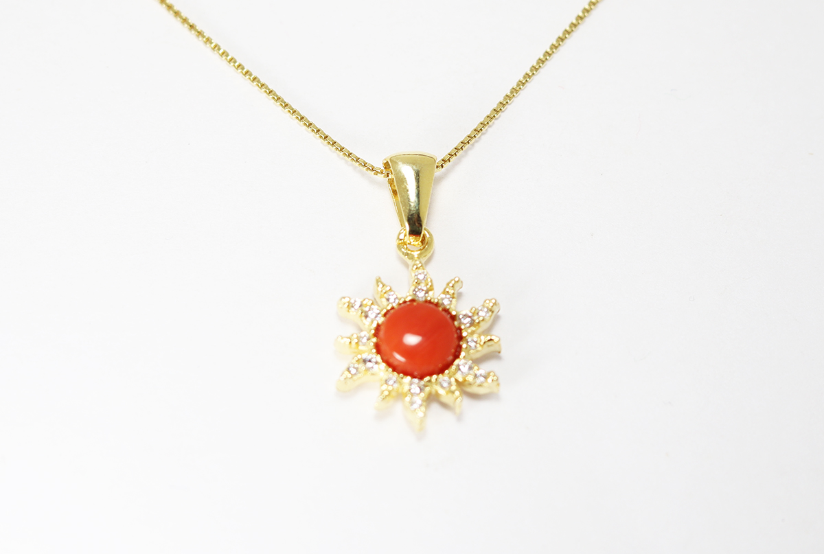 CIONDOLO SOLE CORALLO, ARGENTO DORATO E ZIRCONI