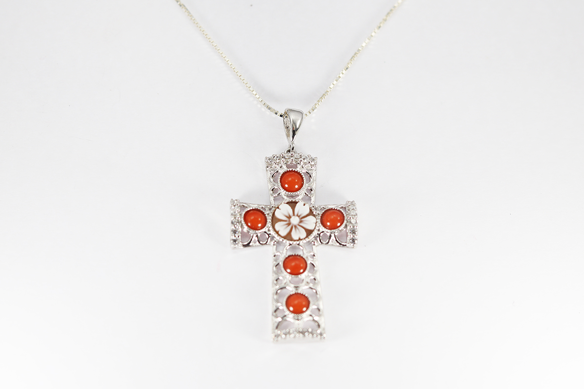 CIONDOLO CROCE CORALLO ROSSO, ARGENTO E ZIRCONI