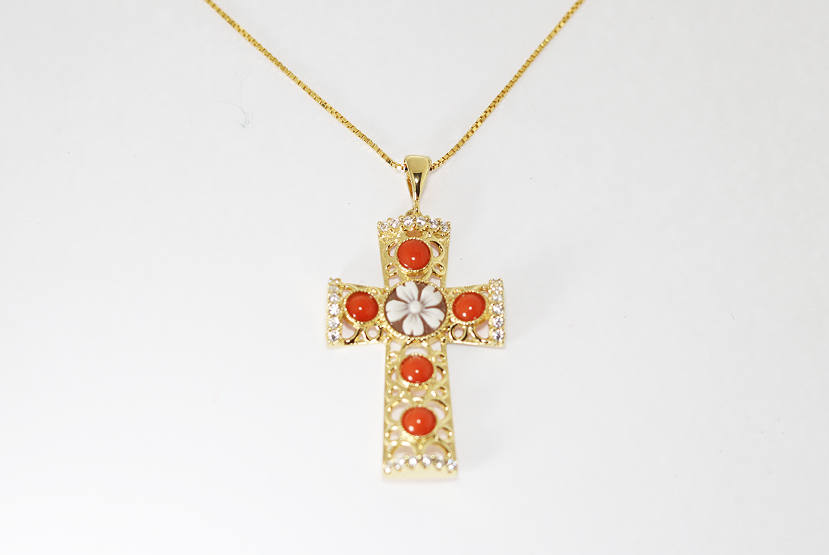 CIONDOLO CROCE CORALLO ROSSO, ARGENTO DORATO E ZIRCONI