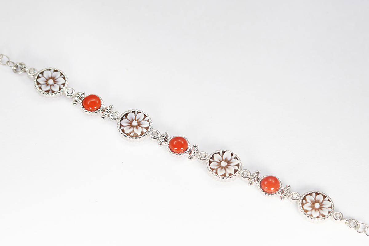 BRACCIALE FIORI E CORALLI, CAMMEI SARDONICA 8MM ARGENTO E ZIRCONI