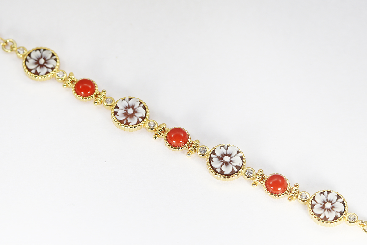 BRACCIALE FIORI E CORALLI, CAMMEI SARDONICA 8MM ARGENTO DORATO E ZIRCONI