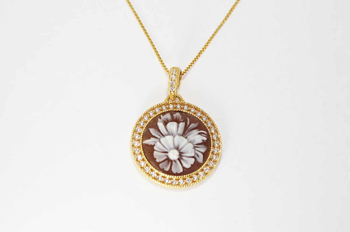 CIONDOLO FIORE CAMMEO CORNIOLA 16 MM ARGENTO DORATO CON ZIRCONI