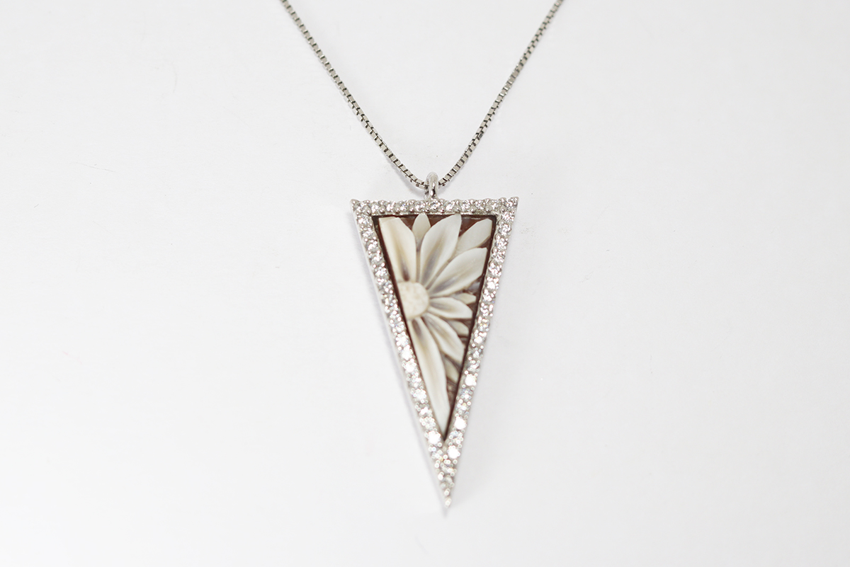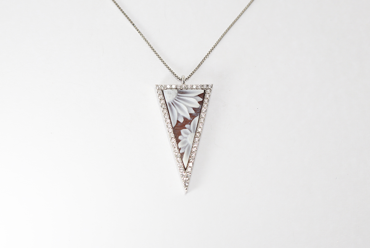 CIONDOLO TRIANGOLO CON FIORI CAMMEO SARDONICA 20MM ARGENTO E ZIRCONI