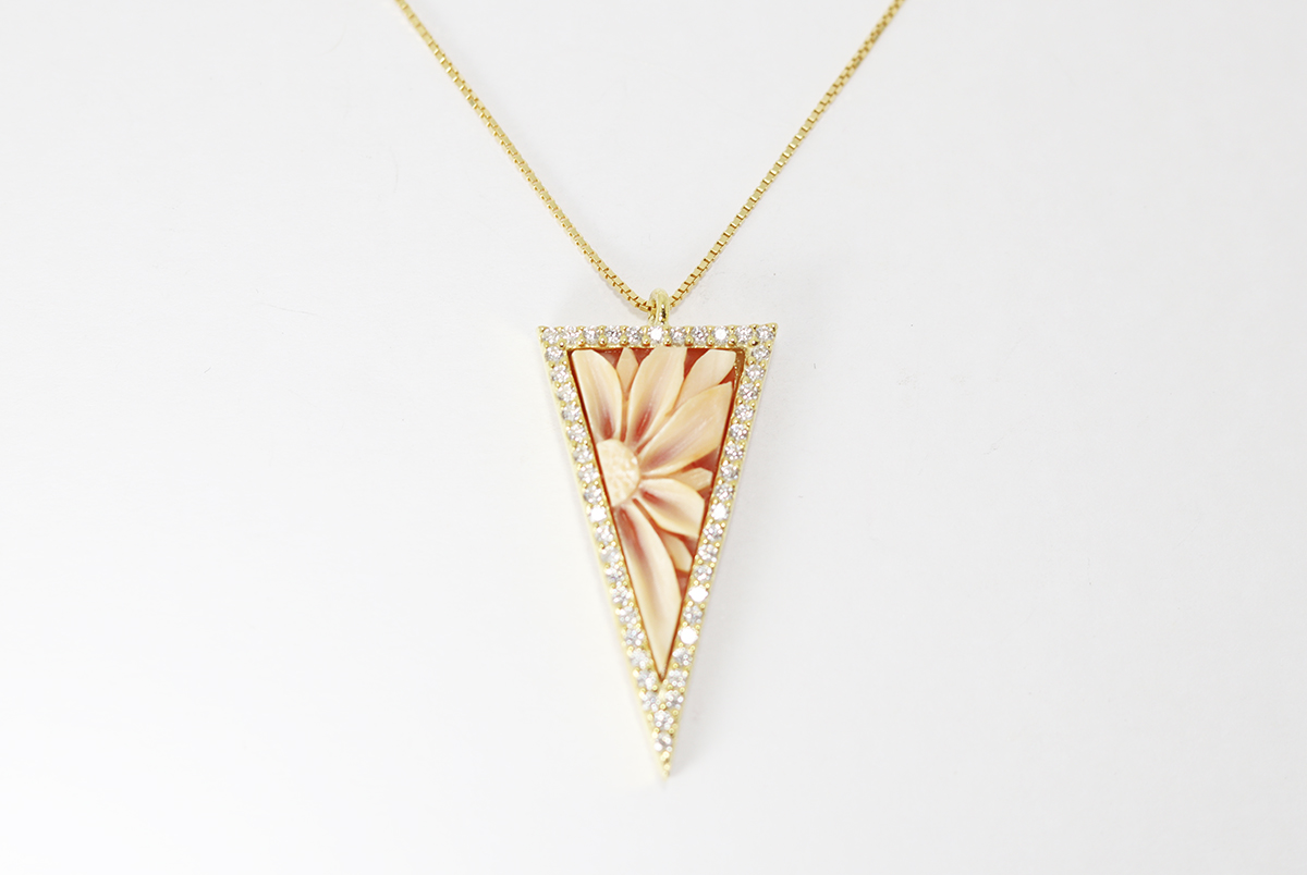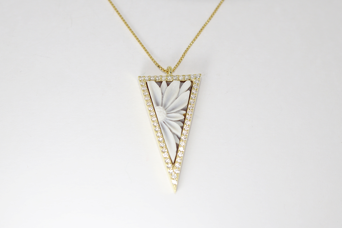 CIONDOLO TRIANGOLO CON FIORE CAMMEO CORNIOLA 20MM ARGENTO DORATO E ZIRCONI