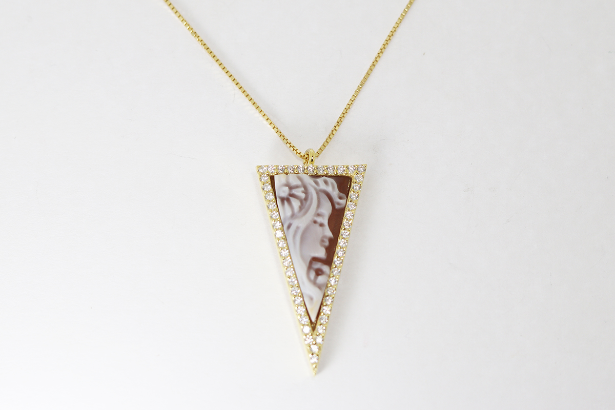 CIONDOLO TRIANGOLO CON DONNA CAMMEO SARDONICA 20MM ARGENTO DORATO E ZIRCONI