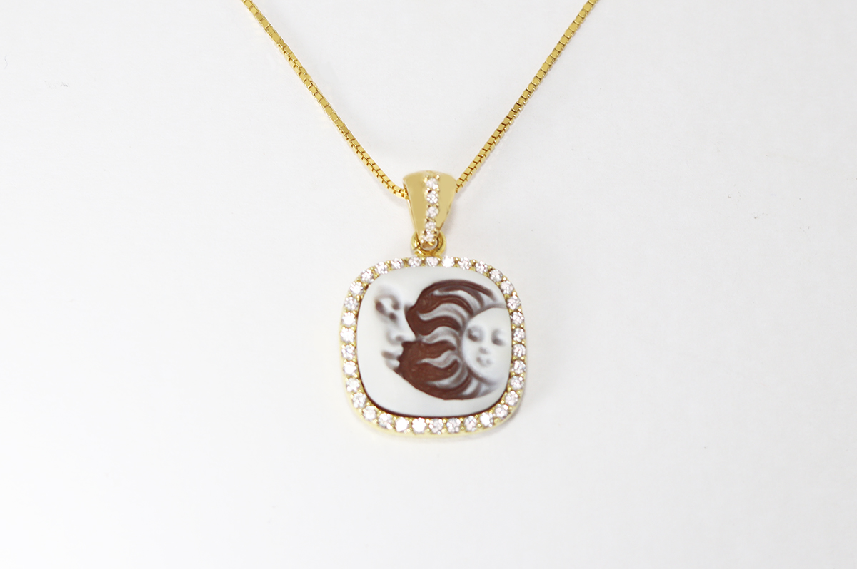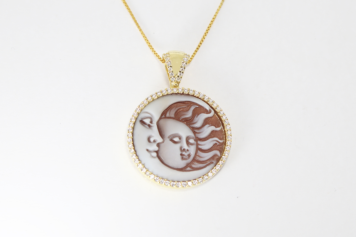 CIONDOLO SOLE E LUNA CAMMEO SARDONICA 14MM ARGENTO DORATO CON ZIRCONI
