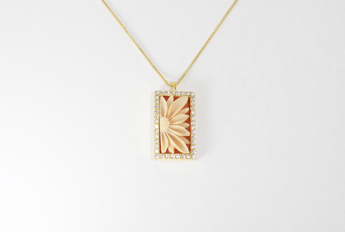 CIONDOLO RETTANGOLO CON FIORE CAMMEO CORNIOLA 16MM ARGENTO DORATO E ZIRCONI
