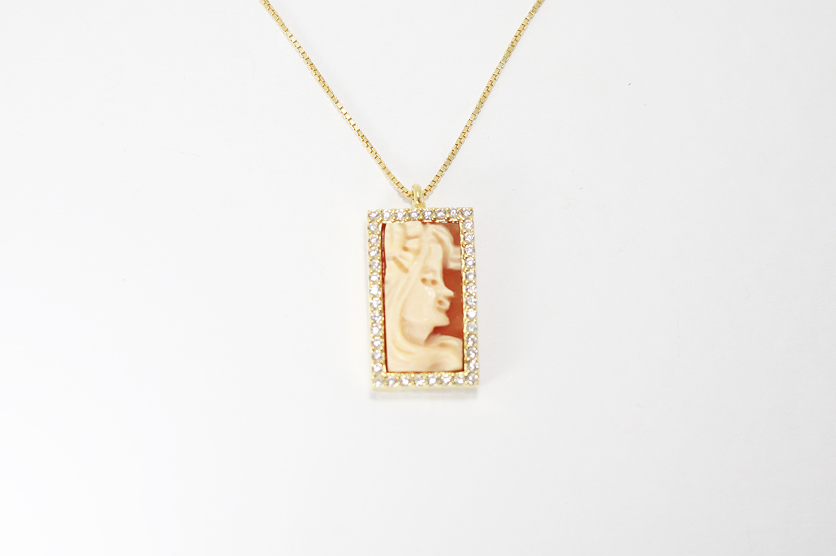 CIONDOLO RETTANGOLO CON DONNA CAMMEO CORNIOLA 16MM ARGENTO DORATO E ZIRCONI
