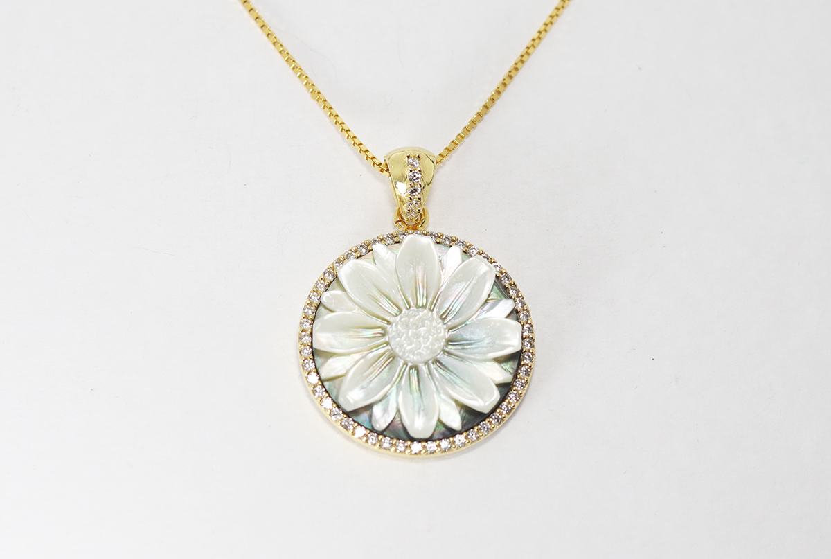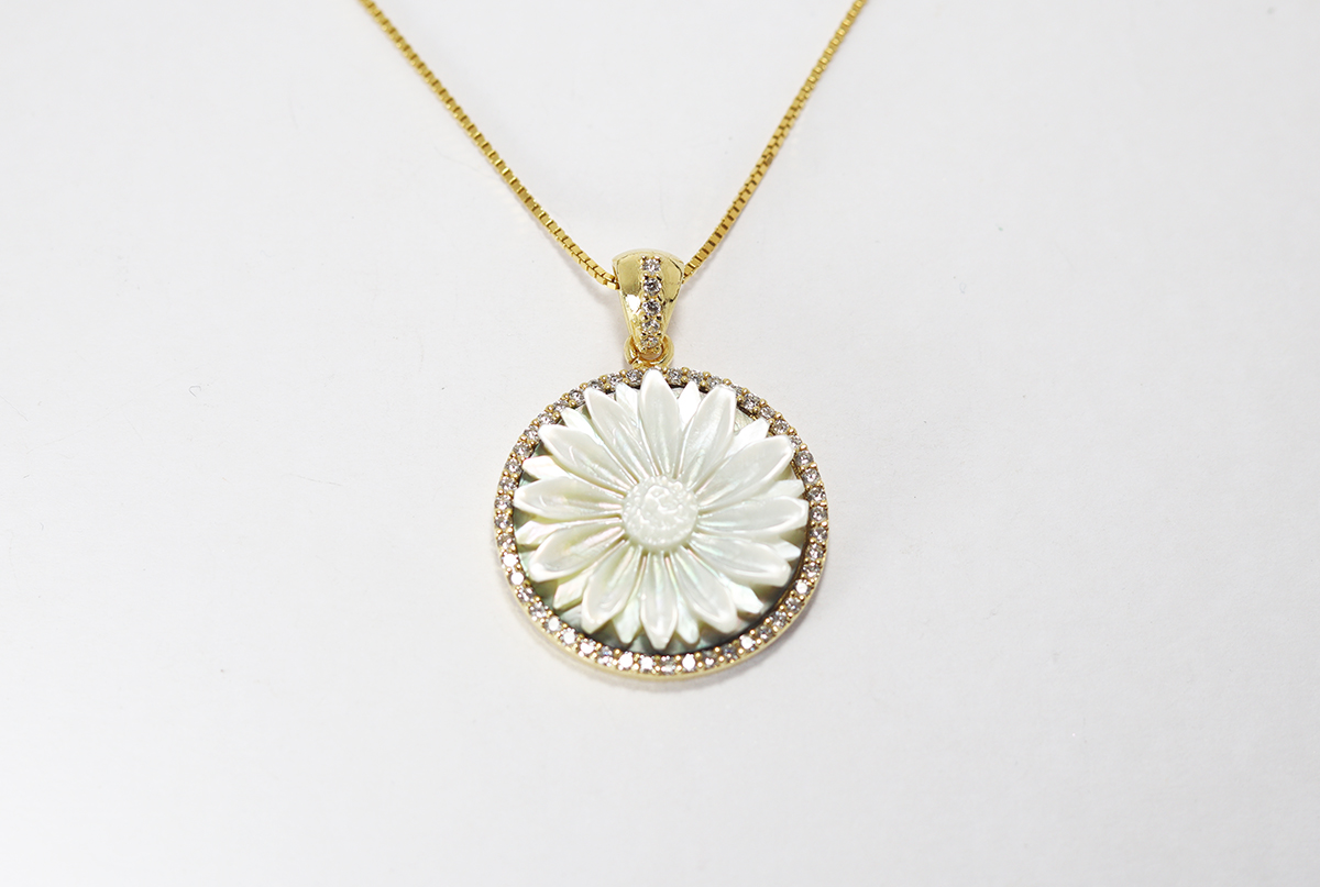 CIONDOLO FIORE CAMMEO MADREPERLA 20MM ARGENTO DORATO CON ZIRCONI